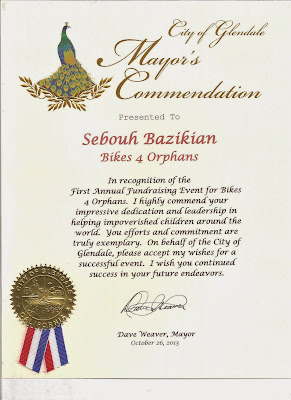Blog Posts UncategorizedOctober 28, 2013Thank you Mayor Dave Weaver!By One Bicycle Foundation I am honored to be receiving this Commendation Award on behalf of the Bikes 4 Orphans’ team. Hopefully you can attend our Bike-a-thon and Hike-a-thon next year! Previous Very Successful Bike-a-thon and Hike-A-Thon, THANK YOU! Next Sean Bird’s Cycling Blog Related Posts More details about the Oct26 bike/hike event. October 14, 2013 Donating Online October 7, 2013 Bikes 4 Orphans is an official non-profit 501(c)3 organization! October 3, 2013 First Annual Fundraising Event for Bikes 4 Orphans September 20, 2013 Comment There is no comment on this post. Be the first one. Leave a comment or Cancel ReplyName* Email* Website Save my name, email, and website in this browser for the next time I comment. Notify me of follow-up comments by email. Notify me of new posts by email. Δ